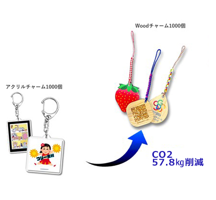 1辺37mmのプラスチック・アクリルノベルティ1000個を Woodチャーム(木製)に切り替えることで、CO2排出量を 約57.78kg削減できます。 これは、アクリル製品のCO2排出をなくすだけでなく 木材が本来持つ「炭素を吸収・固定する力」による効果を合わせた数値です。